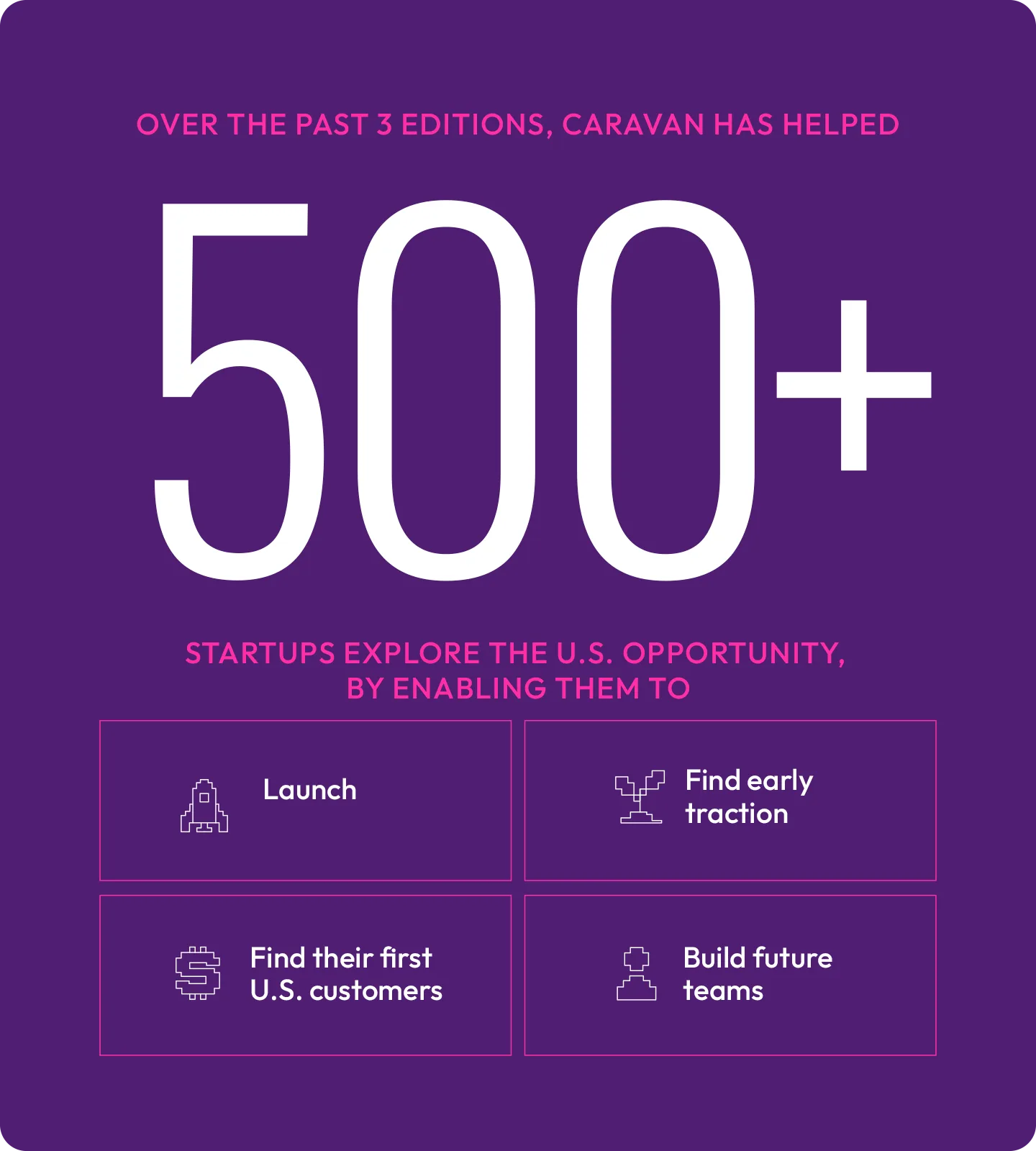 Over the past 3 editions, Caravan has helped 500+ startups explore the U.S. opportunity – enabling them to launch, find early traction, find their first U.S. customers, and future teams.